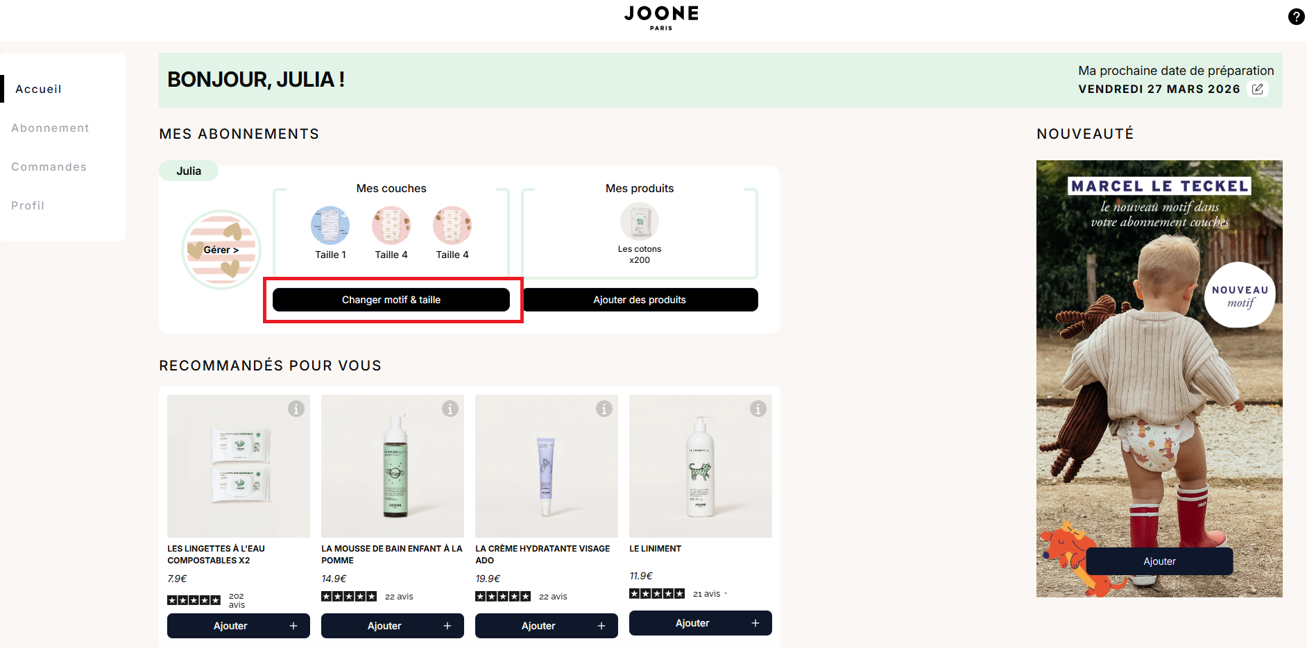 🦊 Pour modifier la taille et le motif de vos couches : rdv dans votre espace client > dans l'abonnement que vous souhaitez modifier > changer tailles & motifs