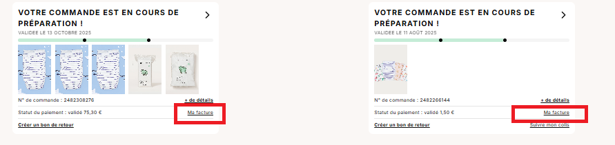 Une fois connectée > onglet "Commandes" puis cliquer sur "Ma facture" :