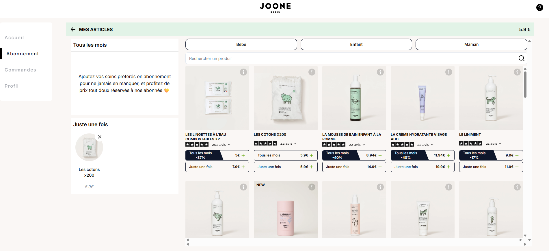 Voilà, on sait que c'est agréable de recevoir tous les mois des cotons ou des lingettes par exemple sans penser au stock ou au refill, alors vous avez la possibilité de vous abonner à certains soins : en clair, tous les mois, vous recevrez votre produit livré avec vos couches, sans frais de livraison en +.